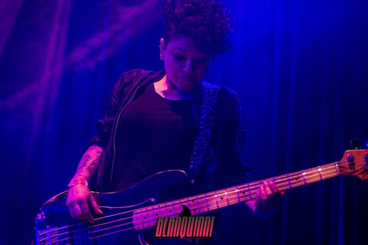 El público iba calentando motores para la llegada de Playa Cuberris, la sala ya estaba a rebosar… era el turno de Kuqui Alegre y viajábamos en el tiempo para descubrir los nuevos sonidos del legado de la Movida Madrileña. O al menos a aquello nos recordaron a unos cuantos. Una actitud ruda, mucha gestualidad, una bajista de golpes contundentes bajo sus creepers (muy punks) y un cantante que lo dio todo sobre el escenario. Sí, incluido cambio de vestuario. 😈