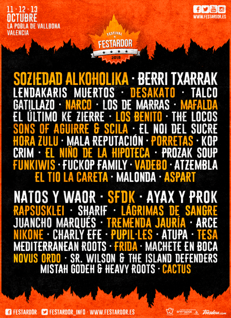 Con respecto al cartel, es complicado no mencionar a cada uno de los artistas, pero, por destacar algunos de ellos, el jueves contaremos con Lendakaris Muertos, Desakato o Natos y Waor. El viernes pasarán por los distintos escenarios Berri Txarrak, Hora Zulú o Ayax y Prok. Y como cierre, el sábado nos espera Narco, Soziedad Alkoholika, SFDK o Rapsusklei. Una muy buena selección de música con la que saltar, sudar y disfrutar de estos tres días en Valencia.