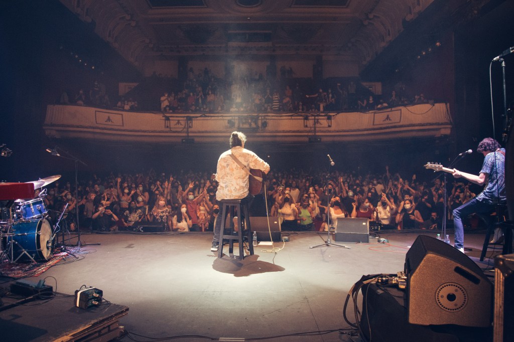 Antes de seguir hay que decir que hace solo dos semanas yo solo había escuchado un par de canciones de Mr Kilombo. Quería escribir sobre alguno de estos artistas que tan en boca estaban en mi círculo cercano de amigos y el primer concierto que vi era el del proyecto de este cantautor de la Alameda de Osuna. Así, tomé dos semanas para escudriñar cada disco de Mr Kilombo y cada maravilloso vídeo acústico que tiene disponible en su canal de Youtube. Una vez bien aprendidas las canciones, me dirigí al Teatro EDP Gran Vía. Si algo bueno ha traído el Covid a la música, es que ahora puede ocupar espacios que antes parecían prohibidos. Que alegría por disfrutar de un concierto en un teatro tan bonito.